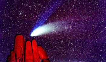 Fotografia do Cometa Hale-Boop em 1997. São visíveis as componentes essenciais de um cometa: a coma, a cauda de poeiras e a cauda de iões ou plasma. Créditos: Wally Pacholka / AstroPics.com