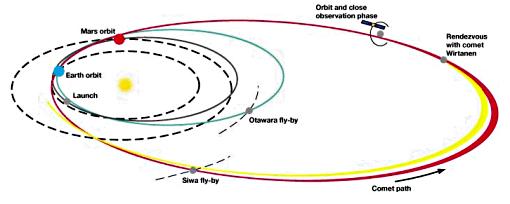 O dia 12 de Janeiro de 2003 é a data prevista de lançamento da missão da ESA, Rosetta, cujo objectivo principal é o estudo detalhado do cometa Wirtanen, o qual alcançará a 29 de Novembro de 2011. Durante esta viagem de quase 9 anos em direcção ao cometa, a Rosetta irá também passar próximo de dois asteróides da Cintura Principal: Otawara (a 11 de Julho de 2006) e Siwa (a 24 de Julho de 2008). A viagem da Rosetta foi planeada utilizando uma técnica conhecida como "gravitational assist" em que o campo gravitacional de um ou mais planetas é usado de forma a mudar a direcção e velocidade de uma nave espacial. Na figura seguinte podemos ver o esquema da viagem da Rosetta utilizando esta técnica. A sonda será inicialmente colocada numa órbita (a cinzento na fig.) que a levará a passar próximo de Marte (a 26 de Agosto de 2005). O encontro próximo com Marte, levará a Rosetta a passar próximo da Terra (a 21 de Novembro de 2005) que por sua a vez a colocará numa órbita (a azul na fig.) que a levará em direcção ao asteróide Otawara. Depois, um novo encontro próximo com a Terra (a 28 de Novembro de 2007) colocará a sonda numa órbita (a amarelo na fig.) que a levará em direcção ao asteróide Siwa, e finalmente, ao encontro com o cometa Wirtanen.