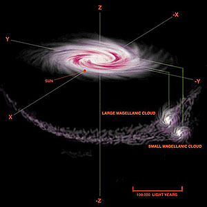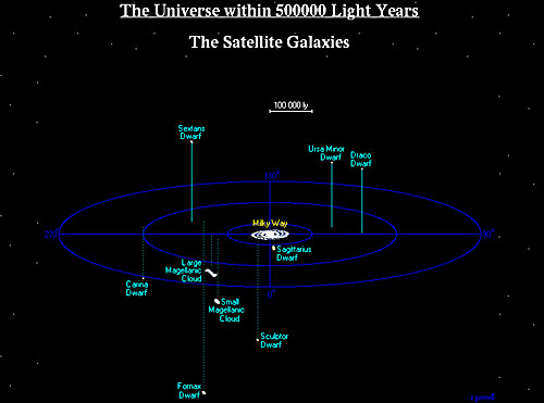 Se regressarmos, no entanto, à nossa própria galáxia e à sua vizinhança imediata, podemos debruçar-nos sobre a interacção entre a Via Láctea e as suas galáxias-satélite.