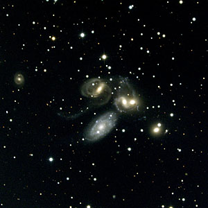 Apesar destas incertezas, manteve-se o nome deste grupo de galáxias - derivado de ter sido incluído pela primeira vez num artigo cientifico pelo astrónomo A.E. Stephan em 1877 - por já ter granjeado grande notoriedade. E, de qualquer modo, a existência de um sistema gravitacionalmente ligado formado por (pelo menos) quatro das galáxias centrais na imagem é inequívoco. Bem como a interacção gravitacional em curso entre algumas delas. Repare-se, por exemplo, nas duas galáxias já tão próximas que estão perto de se amalgamarem completamente.