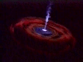 Inicialmente pensou-se que tanta energia era consequência de choques entre galáxias, mas logo se percebeu que mesmo este processo não seria suficiente para explicar toda a energia libertada. Uma outra sugestão, feita por G. Burbidge, propunha que a actividade extra vinha de uma série de explosões de supernovas que se desencadeavam na região central da galáxia. Embora esta proposta não tenha sido muito desenvolvida na altura, voltou a suscitar algum interesse mais recentemente para a explicação de alguns fenómenos em AGN. No entanto, foi a proposta feita por Hoyle e Fowler em 1963 que viria a ser geralmente aceite como a origem do fenómeno da actividade dos AGN. Estes investigadores propuseram que a extraordinária energia destas fontes de rádio era de origem gravitacional, derivada do colapso de objectos elevada massa sob os seus campos gravitacionais fortíssimos. Assim nasceu a ideia de que a espantosa actividade das fontes de rádio-frequência era o resultado da existência de um objecto extremamente massivo no seu centro. Feitas as contas a quantidade de energia libertada por estas fontes e a sua variabilidade, deduz-se que este objecto, normalmente conhecido por buraco negro, deverá ter massas entre o milhão e os mil milhões de massas solares, e estar concentrado numa região de cerca de 20 mil milhões de Km! Mas como pode um buraco negro massivo explicar a actividade dos AGN em geral? A ideia básica é que quando as galáxias são jovens as estrelas que estão na sua região central estão tão próximas que colidem e se aglutinam dando origem a um buraco negro massivo. O potencial atractivo deste objecto é tão poderoso que capta material que se avizinha e que pode ser ou uma estrela, ou gás do meio interestelar da própria galáxia ou até mesmo de uma galáxia vizinha. Acredita-se que este processo de 'alimentação' se faz através de um disco, chamado de acreção, e que neste processo seja emitida a radiação que vai desde o infravermelho ate aos raios-gama. Por exemplo, para manter os níveis de actividade observados nos AGN será preciso 'alimentá-lo' com uma massa equivalente a várias massas solares em cada ano... (*) Um ano-luz corresponde à distância que se percorreria ao fim de um ano viajando à velocidade da luz, ou seja, cerca de 9x1012Km
