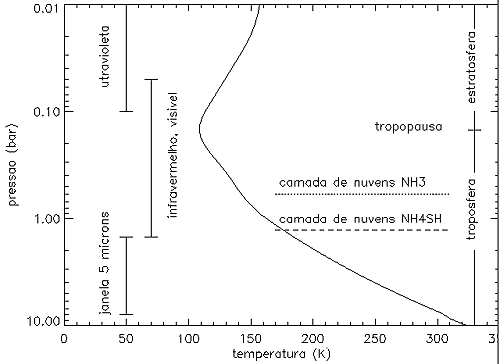 Júpiter é o maior planeta do sistema solar e é um dos gigantes gasosos. Com a espectroscopia só podemos observar directamente até uma profundidade de aproximadamente 100 km tendo a atmosfera uma espessura de 60.000 km ! É muito importante lembrarmo-nos disto, porque quer dizer que tudo o que se encontra por baixo desta camada acessível através de observação directa, tem de ser deduzido por meios indirectos. Também o módulo de entrada que penetrou na atmosfera no dia 7 de Dezembro de 1995, não atingiu muito mais que 150 km por baixo da camada visível de nuvens. Graças à grande quantidade de observações feitas nos anos 70 pelas sondas Pioneer e Voyager, sabemos bastante sobre a estrutura deste planeta e a sua composição. Júpiter é constituido principalmente por gás de hidrogénio molecular (H, 86 %) e hélio (He, 14 %). Mais no interior, onde a temperatura e a pressão sobem consideravelmente, o hidrogénio molecular transforma-se em hidrogénio metálico (hidrogénio muito comprimido com características de metal). Além disso há provavelmente um núcleo rochoso, com 10 vezes a massa da Terra. Limitar-nos-emos à parte da atmosfera que é acessível através de observação directa. Como não há superfície sólida, indica-se as alturas relativamente ao nível onde a pressão da atmosfera é de 1 bar (correspondente à pressão média à superfície terrestre), ou então fala-se simplesmente em termos de níveis de pressão. Com a espectroscopia, podemos sondar níveis de pressão desde alguns milibares até 8 bar, cobrindo uma região vertical de aproximadamente 200 km. Para pressões maiores que 0,15 bar, a temperatura aumenta com a pressão; é a chamada troposfera. A tropopausa é uma região de transição. Por cima dela encontra-se a estratosfera, onde se passa o contrário que na troposfera, i.e. a temperatura diminui quando a pressão aumenta (a pressão aumenta constantemente quando entramos na atmosfera, tanto na estratosfera como na troposfera). Esta estrutura térmica é uma das informações que, utilisando bandas de absorção apropriadas, se pode tirar dum espectro, como foi explicado na primeira parte desta série de artigos. No caso de Júpiter só é possível para pressões menores que 1 bar; para pressões acima de 1 bar, o perfil térmico é extrapolado. Depois da entrada do módulo de Galileo na atmosfera, temos pela primeira vez medições directas da temperatura e da pressão. Viu-se que não estavamos muito longe da realidade quanto ao perfil térmico para pressões maiores que 1 bar. Mas é preciso ter cuidado em comparar resultados das medições do módulo e de espectroscopia, pois o módulo fez observações muito locais (numa escala de alguns metros), enquanto que com a espectroscopia vemos regiões de algumas centenas de quilómetros ou mais, e obtemos por isso uma média!