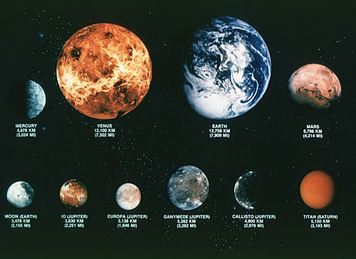 Titã tem um raio de 2575 km, e é por isso muito menor que os outros três. Não é constituído só por silicatos, mas sim por uma mistura de gelo e silicatos em iguais proporções, sendo por isso menos denso que Vénus, a Terra e Marte. Mas a sua atmosfera, formada principalmente por azoto e metano, é muito semelhante à da Terra primitiva. Há 4000 milhões de anos não existia oxigénio na Terra.