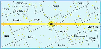 | Como resultado do movimento de translação da Terra, a posição do Sol na esfera celeste dá uma volta completa num ano, percorrendo as constelações do zodíaco. Na altura em que o Sol se encontra numa dessas constelações, as suas estrelas não são visíveis, pois estão ofuscadas pelo brilho solar. Mas os astrónomos antigos registaram o movimento das constelações logo após o crepúsculo e verificaram a sua aproximação à nossa estrela. Perceberam assim qual a altura do ano em que o Sol passava pelas constelações do zodíaco. A gravura mostra a posição actual do Sol no início da Primavera, no chamado equinócio vernal. |