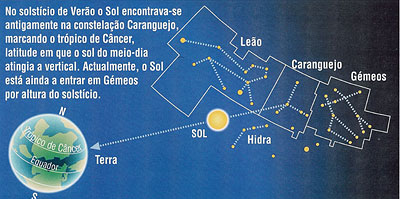 A imagem mostra a posição do Sol visto da Terra e projectado contra a esfera celeste, no tempo dos Gregos antigos por alturas do solstício de Verão. Actualmente, projecta-se entre Touro e Gémeos por alturas do solstício |  |