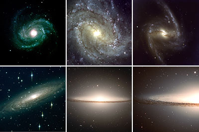 Galáxias espirais São planas, com forte rotação. Apresentam essencialmente dois grupos de populações: no disco aparecem estrelas jovens, ricas em metais (de população I) e no bojo e halo estrelas de população II. Isto faz com que o disco seja mais azul que o bojo (mais formação estelar, estrelas quentes, nuvens moleculares, SN II, regiões H II, starbursts). Existem bandas de poeira. A sua elipticidade é geralmente b/a < 0.3. É de notar que quando estas galáxias têm núcleos activos, não estão geralmente associadas a emissão rádio.
