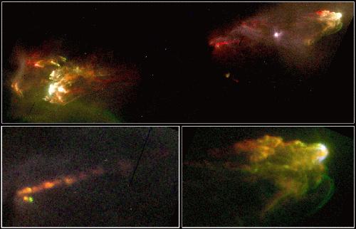 Por vezes não é possível nos apercebermos da presença da estrela em formação, dado não ser possível aceder, na banda do visível, aos estágios iniciais de formação de uma estrela, isto pelas razões já enunciadas atrás. Mas muitas vezes podemos ver estas formações resultantes da actividade proto-estelar. É o caso dos objectos visíveis na figura 12. Nessa imagem, obtida com o HST, são bem visíveis os objectos HH1 e HH2, os primeiros do género a serem descobertos.