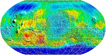 Uma cartografia feita pelo GRS da distribuição de hidrogénio na superfície de Marte revelou grandes quantidades deste elemento onde se esperava - nos pólos - mas também um pouco por todo o planeta, ou seja, Marte é rico em água.