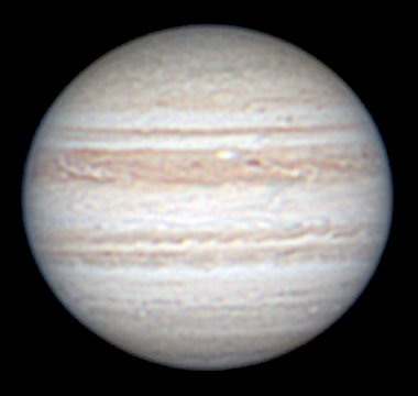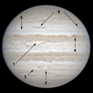 Exemplos de algumas das formações atmosféricas Jovianas cujo aparecimento, posicionamento, e alterações ao longo do tempo devem ser monitorizados. 1- surgimento de “plumas” equatoriais, nuvens brancas, brilhantes, que normalmente seguem as projecções azuladas do NEBs; 2- morfologia e posição de ovais anticiclónicas do STB, por vezes de grande dimensão mas podendo exibir um baixo contraste; 3- surgimento de pequenas ovais, brilhantes ou escuras que, quando se colocalizam nas mesmas latitudes, são potenciais alvos de interacção ou mesmo fusão; 4- surgimento, morfologia e posicionamento de formações ciclónicas do NEBn designadas “barcaças”, que também podem interagir mutuamente; 5- visibilidade, cor e contraste de bandas a nível das zonas, neste caso concreto a NTrZB, as quais não devem ser confundidas com cinturões situados a latitudes próximas e por vezes atenuados; 6- NTB atenuado, mas apresentando alguns sectores com contraste mantido, dos quais as coordenadas das extremidades “p.” e “f.” devem ser determinadas. Crédito: António Cidadão. |  |