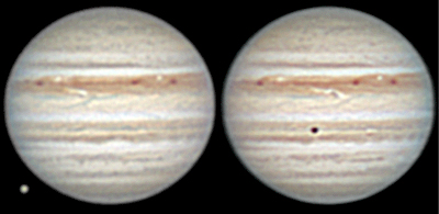 Imagens de Júpiter, obtidas com 3 dias de intervalo, mostrando alguns aspectos da evolução de um dos eventos mais dinâmicos que pode ser observado a nível do NEB. Uma perturbação (“rift”) de nuvens brilhantes que habitualmente evolui de N para S no cinturão, e deriva em longitude muito mais rapidamente que outras estruturas situadas no NEBn, neste caso duas ovais anticiclónicas e três pequenas “barcaças”. Clique na imagem para activar uma pequena animação numa nova janela, a qual mostrará o fenómeno e confirmará que, na interface S do NEB, a perturbação progrede segundo o sistema I de rotação característico nas projecções azuladas do NEBs. Na imagem da esquerda, Calisto encontra-se próximo do limbo seguidor do planeta, e na da direita Io encontra-se em trânsito sobre o SEB projectando a sua sombra neste cinturão. Crédito: António Cidadão. |