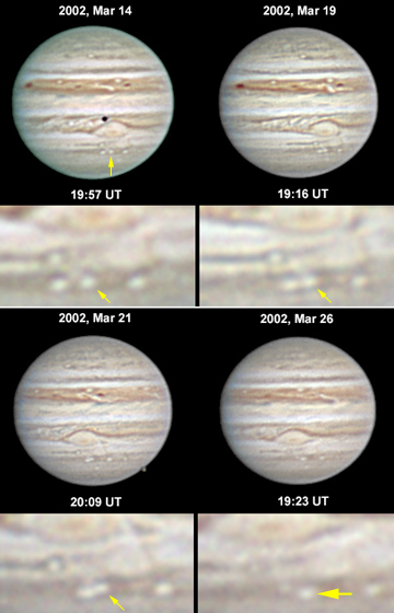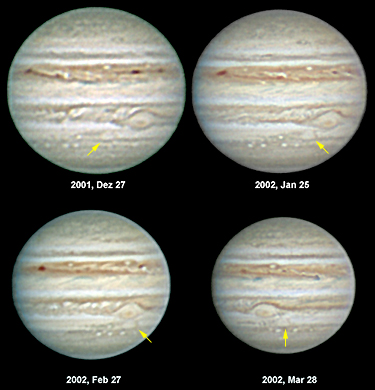Na última quinzena de Março de 2002 ocorreu a fusão de duas ovais anticiclónicas do SSTB, situadas aproximadamente à latitude 40ºS, as quais se encontravam presentes em Júpiter há longos anos. Este tipo de eventos costuma ser rápido, e pode ser desencadeado pela acumulação de perturbações exercidas sobre o par de ovais em interacção por formações atmosféricas próximas. Neste caso concreto, a fusão deu-se quando as duas ovais anticiclónicas estavam simultaneamente em conjunção com a GRS, tendo além disso sido pouco tempo antes ultrapassadas pelo anticiclone “BA”, situado imediatamente a Norte, no STB. Medições posicionais efectuadas durante o evento indicaram que a oval assinalada pela seta amarela sofreu uma desaceleração brusca da sua deriva em relação à pequena oval que a seguia, aproximando-se dela e posicionando-se temporariamente um pouco mais a Norte imediatamente antes da fusão. A previsão e acompanhamento deste tipo de acontecimentos, interessantes e dinâmicos, está perfeitamente ao alcançe de amadores, desde que exista adequada estabilidade atmosférica para a visualização das ovais, e rotinas observacionais que atempadamente detectem alterações do seu posicionamento relativo, concretamente uma aproximação mantida. Clique na imagem para activar uma pequena animação numa nova janela, a qual mostrará o dinamismo do evento em projecções cilíndricas do disco Joviano. Será também evidente a evolução de perturbações no NEB. A imagem de 21 de Março mostra a sombra de Europa no disco planetário, e a de 21 de Março Calisto terminando o seu trânsito. Crédito: António Cidadão. |