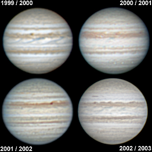 Imagens de Júpiter obtidas em quatro aparições sucessivas mostrando alterações significativas, mas de estabelecimento lento, que se vão ciclicamente sobrepondo ao padrão clássico de bandas claras e escuras. Em 1999-2000, por exemplo, Júpiter exibia numerosas projecções azuladas do NEBs, muito contrastadas, e uma NTrZ ampla devido à retracção do limite N do NEB. Já em 2000-2001 assistiu-se a um esbatimento considerável das projecções azuladas do NEBs e uma expansão para N do NEB, este último conseguido à custa do estreitamento da NTrZ. Em 2001-2002 a EZn ganhou uma coloração amarelada, mantendo-se atenuadas as projecções do NEBs. Observou-se ainda o início de mais um ciclo de retracção do NEBn, visível na imagem a nível do sector do cinturão que segue a “barcaça” (notar que a NTrZ é mais espessa a partir daí). Por outro lado, a partir de 2002-2003 esbateu-se a tonalidade amarelada da EZn, atenuou-se progressivamente o NTB e intensificou-se o contraste da NTrZB. Embora os limites, em latitude, dos cinturões e zonas possa variar com o tempo, o posicionamento das correntes atmosféricas parece ser muito estável. De igual modo, embora a dimensão e o contraste das projecções do NEBs varie consideravelmente, o seu número total parece não sofrer grandes alterações. No entanto, quando se analisam os padrões atmosféricos de datas muito anteriores, algumas alterações mais dramáticas podem ocorrer. A título de exemplo, no século XIX as projecções azuladas surgiam do SEBn e não do NEBs, e a GRS tinha uma extensão em longitude cerca do dobro da observada presentemente. Crédito: António Cidadão. |