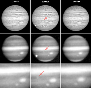 A utilização concertada de filtros de infravermelho de banda larga (em cima) e de filtros da “banda de metano” (no meio, ampliado na fila de baixo), permite abordar a estrutura vertical da atmosfera Joviana. Nesta pequena sequência de imagens, obtida de dois em dois dias, assiste-se ao surgimento (seta vermelha) e subsequente desaparecimento de uma pequena nuvem brilhante na perturbação caótica que segue a GRS. O filtro da “banda de metano”, que demonstra selectivamente as neblinas e nuvens mais altas, confirma que se trata de uma formação que no seu desenvolvimento atingiu as regiões da atmosfera onde existe uma pressão inferior a 0,5bar. Nas imagens obtidas a 29 de Janeiro de 2002 Ganimedes está iniciar um trânsito. Clique na imagem para activar uma pequena animação numa nova janela, a qual mostrará o surgimento da nuvem em imagens obtidas com o filtro infravermelho de banda larga e, simultaneamente, muitos outros aspectos do dinamismo da atmosfera de Júpiter. Crédito: António Cidadão. |