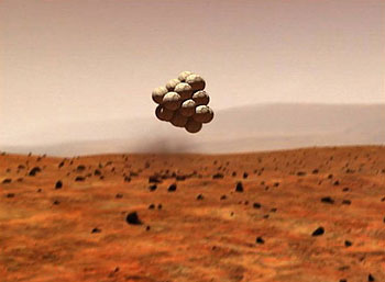 A chegada de um rover a Marte com os airbags insuflados (JPL/NASA).