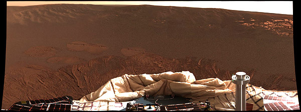 Uma imagem da cratera onde caiu o Opportunity. Á direita vê-se um afloramento rochoso que foi o primeiro alvo estudado pelo rover. (NASA/JPL)