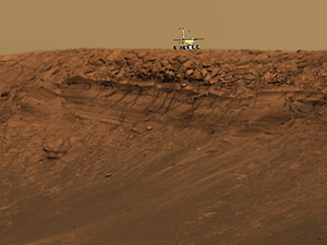 Esta imagem mostra o tamanho aproximado do Opportunity junto à cratera Endurance. O rover acabou por descer as encostas da cratera em busca de pistas sobre o passado desta região. (NASA/JPL/Cornell)