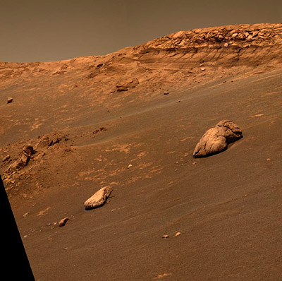 O robô passou praticamente dois meses entretido dentro do buraco, onde dedicou toda a sua atenção a um afloramento rochoso que salta à vista nas imagens. Este afloramento foi um golpe de sorte para o rover. Nunca tinha sido visto nada de parecido em Marte. As suas rochas parecem que estiveram no passado em contacto com água. O Opportunity detectou aqui níveis elevados de enxofre provavelmente sob a forma de sais de sulfato. Na Terra, os sais de sulfato formam-se normalmente na água ou, depois da formação, sofrem alterações por longas exposições à água. Além disso, observou também em duas rochas estratos muito finos de material sedimentar que apresentam uma forma de distribuição ondulada. A interpretação para este tipo de forma é que os sedimentos em questão foram depositados por água corrente em camadas onduladas. No nosso planeta, este tipo de estratos vê-se muito em rochas à beira-mar. Sendo assim, parece credível que a planície onde está o rover tenha sido em tempos um mar salgado. Mas o rover não olhou apenas para as rochas do afloramento, também olhou para o chão onde descobriu com o seu microscópio de imagem (MI) pequenos grãos irregulares com 2 a 3 mm de diâmetro que parecem “mirtilos” e que cobrem tanto o chão da cratera como as rochas em volta. Na sua origem podem estar processos de erosão aquosos e há até especulações sobre uma possível origem biológica para este tipo de estruturas.