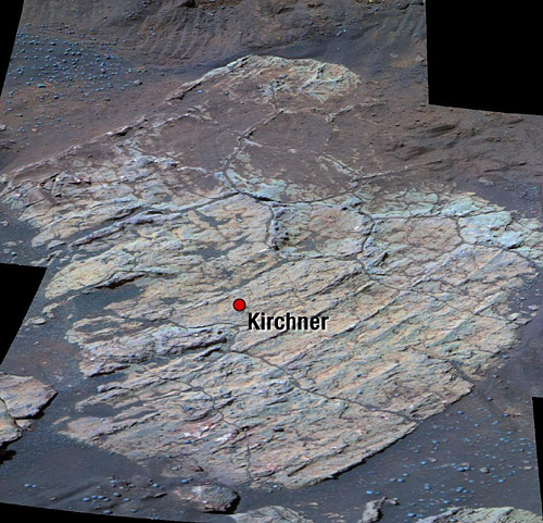 Esta imagem em cores falsas mostra a rocha "Escher" situada na encosta sudoeste da cratera Endurance. Não se sabe como surgiram as falhas que atravessam a rocha, mas uma possibilidade é que tenham sido provocadas pela acção de água. O rover gastou 14 dias marcianos a investigar esta rocha (principalmente o alvo chamado "Kirchner"), e outras rochas semelhantes com os seus instrumentos científicos. A imagem foi tirada a 24 de Agosto pela câmara panorâmica do robô. (NASA/JPL/Cornell)