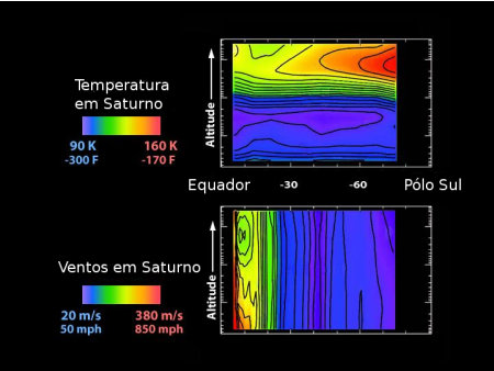 Este é um primeiro resultado obtidos com dados do instrumento CIRS (Composite InfraRed Spectrometer) sobre a temperatura e intensidade dos ventos na alta atmosfera de Saturno. Crédito: NASA/JPL/GSFC.