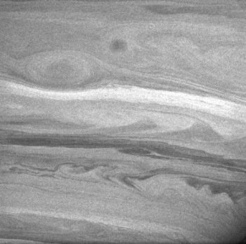 A atmosfera de Saturno parece ser menos espectacular do que a atmosfera de Júpiter. Mas esta imagem, processada para aumentar o contraste, sugere que processos semelhantes ocorrem nos dois maiores planetas do Sistema Solar. Esta imagem foi obtida num comprimento de onda fortemente absorvido pelo metano, mostrando estruturas situadas na alta atmosfera de Saturno. Crédito: NASA/JPL/Space Science Institute.