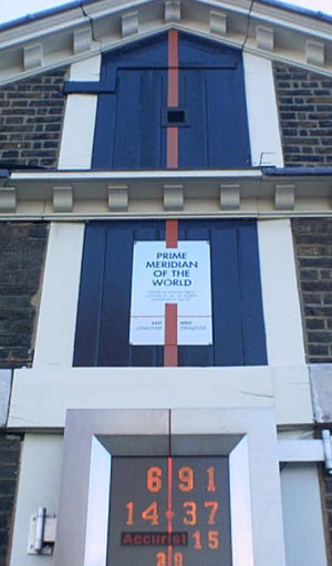 O meridiano de Greenwich em Inglaterra desenhado na face de um dos edificios do Observatório.