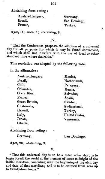 Seguiu-se a votação. A resolução adotando Greenwich como o meridiano origem, foi aprovada por 22 votos. O único voto contra foi o de Santo Domingo, hoje, Haiti. A França e o Brasil se abstiveram. Logo em seguida, William Tompson fez um apelo para que a França e os outros países que não votaram a favor da decisão aprovada pela Assembléia levasse em consideração a posição adotada pela maioria. A aceitação de Greenwich não foi aceita facilmente. Paris, as Pirâmides do Egito, Jerusalém seriam sérios concorrentes. Para os franceses era incompreensível e sobre tudo inadmissível que não fosse Paris, mas um lugarejo de Londres que fosse escolhido para o centro mundial. Numa última tentativa para salvar a honra, a França tentou obter uma concessão: ela aceitaria Greenwich somente com a condição de que a Grã-Bretanha passasse adotar o sistema métrico, mas isso não era o caso. A Grã-Bretanha continuou usando o sistema imperial com as suas milhas, varas, libras e pintas -, e Greenwich transformou no GMT, mas o rancor dos franceses perdurou durante alguns anos. Só em 1911 eles aceitaram oficialmente o Greenwich Meridian Time e ainda na França passou-se a chamar o GMT como “tempo de Paris menos 9 minutos e 9 segundos”.
