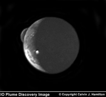 Esta histórica imagem mostra as primeiras provas de actividade vulcânica fora da Terra. A pluma eruptiva de Pele (a deusa havaiana do fogo) destaca-se claramente da forma de Io, e a mancha brilhante junto ao terminador é outra pluma, baptizada Loki, um deus nórdico. Crédito: Calvin J. Hamilton.