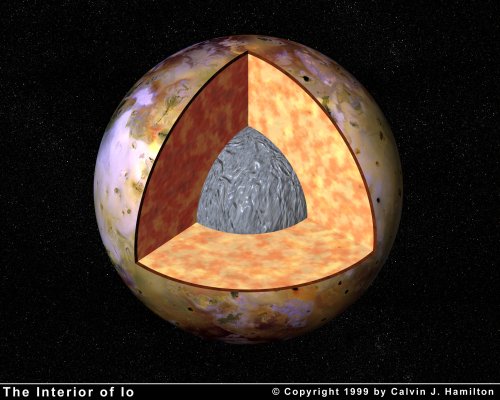 O modelo de estrutura interna de Io não difere muito do habitual, pelo menos numa grande escala: núcleo, manto e crosta. Crédito: Calvin J. Hamilton.