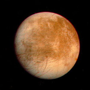 Esta imagem, obtida por uma das Voyager, mostra a face "suja" de Europa, na qual o gelo se apresenta coberto por materiais que lhe dão um aspecto avermelhado. Crédito: NASA.