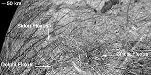 Porém, as estruturas existentes na superfície de Europa contam uma história complexa. De facto, encontrar uma zona verdadeiramente plana na face deste satélite é difícil, já que aquilo que, a baixa resolução, parecia liso como uma bola de bilhar, se revelou na realidade uma justaposição de cristas e vales delimitados por fracturas. Além disso, existem regiões que são conhecidas como zonas caóticas e que fazem lembrar o aspecto de um mar gelado, tal e qual a recente descoberta em Marte. Estas regiões são geralmente apresentadas como locais de actividade mais recente, devida à subida de material quente do interior.