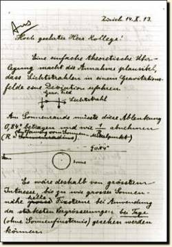 Nesta carta de 1913, Einstein apela ao astrónomo americano G.E. Hale para medir o efeito da gravidade sobre os raios luminosos.
