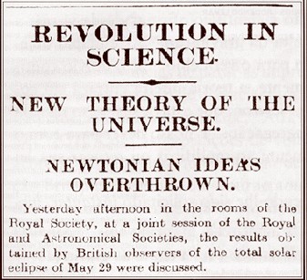 Os dez anos seguintes foram anos de recepção, afirmação e sucesso da teoria. Em 1918 surgiram os primeiros dois livros devotados à relatividade geral, um em Londres por Eddington, e outro em Berlim por Herman Weyl. A 29 de Maio de 1919 o encurvamento dos raios luminosos rasando o Sol foi medido na Ilha do Príncipe e no Sobral (Brasil) durante um eclipse solar, graças ao zelo de Eddington e do Astrónomo Real britânico Frank Dyson. As previsões da teoria de Einstein foram publicamente confirmadas no famoso encontro da Royal Society em Londres a 6 de Novembro de 1919. No dia seguinte, no cabeçalho do jornal londrino Times podia ler-se: “Revolução na Ciência/ Nova Teoria do Universo/ Ideias Newtonianas Abandonadas.”