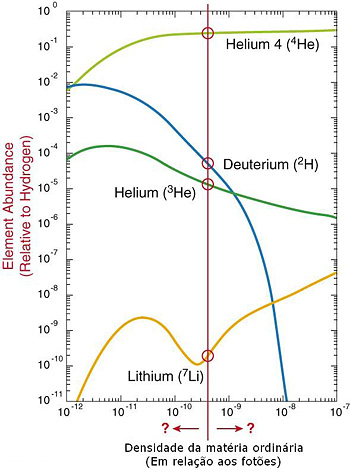 A abundância prevista para o deutério, hélio e lítio depende da densidade de massa-energia de matéria ordinária no universo primitivo, como se vê na figura junta. Estes resultados indicam que a produção de hélio é relativamente insensível à abundância de matéria ordinária, acima de um certo limiar. É de espera que genericamente cerca de 24% da matéria ordinária no universo seja proveniente da produção de He no big bang. Isto está em muito bom acordo com as observações e é um dos grandes triunfos do modelo do big bang. É possível, no entanto, submeter o big bang a testes mais delicados. Em particular, para que as produções previstas de outros elementos leves estejam de acordo com as observações, a densidade de massa-energia global deve representar cerca de 4% da densidade crítica, isto é, do valor da densidade total (matéria ordinária+”matéria escura”+ “energia escura”) correspondente ao modelo plano. O satélite Wilkinson Microwave Anisotropy Probe (WMAP), lançado a 30 de Junho de 2001, do qual falaremos mais adiante, deve ser capaz de medir directamente a densidade da matéria ordinária e comparar os valores observados com os previstos pela NBB.
