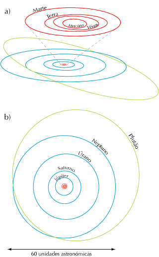 Órbitas dos planetas em perspectiva (a), e em planta (b). A encarnado, e ampliado em a), estão representadas as órbitas dos planetas rochosos, a azul as dos gigantes gasosos, e a verde a órbita de Plutão. Na figura b) o sentido orbital é o contrário ao dos ponteiros do relógio.