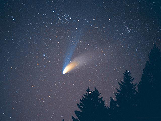 Cometa Hale-Bopp. As duas caudas são bem visíveis, a cauda de gás (iónica) em tom azulado, e a cauda de poeira, arqueada e alaranjarada.