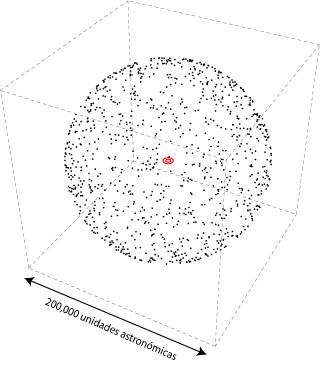 Ilustração da "nuvem de Oort". No centro, a encarnado, estão representadas as órbitas dos planetas.
