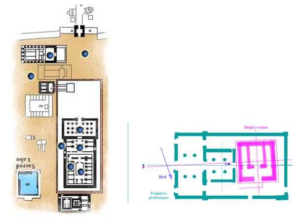 É evidente que esta euforia inicial deixou lugar a um estudo mais aprofundado e científico sobre a datação do mesmo. O templo do nascimento de Isis (Figura 4.2) construído no reinado de Augusto ( 30 a. C) está construído sobre as fundações de um templo da época ptolemaica do reinado de Nectanébo I (381 a. C) e acabado por Ptolomeu X Alexandre I (107 a. C.), este ultimo apresenta uma orientação Oriente-Ocidente, por sua vez o templo da época de Augusto tem orientação Norte-Sul idêntica a orientação do grande templo de Hathor. No entanto entre um e outro existe uma ligeira inclinação de cerca de 2º30’.