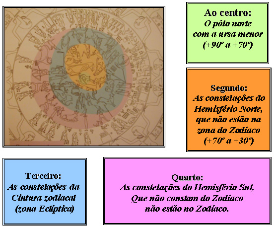O circulo celeste, representado pelo Zodíaco, é suportado por doze deuses, quatro femininos e oito de joelhos (Figura 4,3). Os deuses com cabeça de falcão simbolizam a eternidade, dando assim um princípio intemporal a cena celeste. As deusas dão o quadro espacial, cada uma indica um ponto cardinal perfeitamente orientado. Ao lado de cada deusa está escrita em hieróglifo o seguinte ritual: