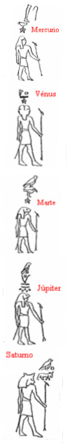 Em suma, temos a representação dos cinco planetas conhecidos na época, com as suas apelações e atributos divinos. Para os antigos Egípcios a visualização destes planetas nos céus nocturnos e a sua representação no zodíaco de Dendera permitia um determinado domínio sobre os seus inimigos, pois a ciência era algo dado apenas a quem tinha domínio sobre os outros.