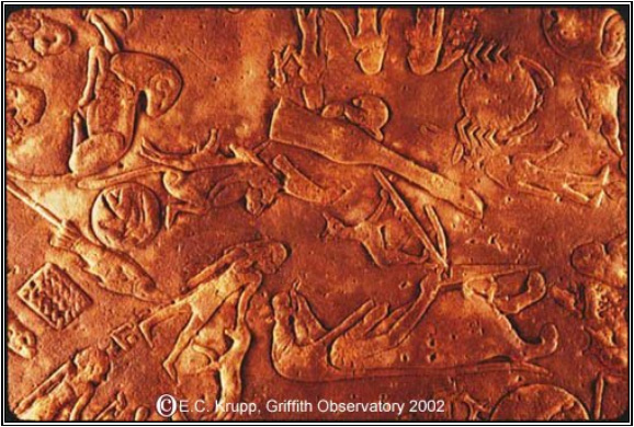 Orion, é aqui representado como sempre o foi, desde o texto das pirâmides (cerca de 2300 a. C.) Orion é o condutor das estrelas no céu do Sul e é considerado a alma de Osíris.