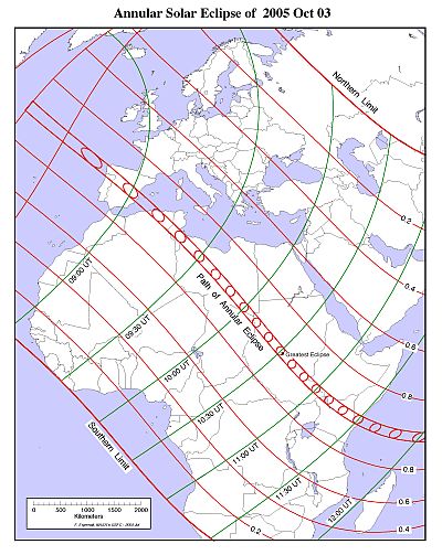 O trilho do eclipse anular começará no Atlântico Norte às 8h41m UT (adicionar mais uma hora para obter a hora legal de Portugal continental), correndo para sudeste e alcançando rapidamente a costa noroeste de Espanha e de Portugal às 8h51m UT. Cinco minutos mais tarde, depois de ter atravessado a região transmontana e o Distrito de Bragança, a sombra evoluirá para Madrid às 8h56m UT, cidade muito próxima da linha central. Começando com um evento central de duração de 4m e 04s na Galiza, Madrid observará a anularidade durante 4m e 11s, com cerca de 90% da superfície do Sol a ser escurecida pela Lua. O eclipse continuará a decorrer, atingindo o seu máximo às 10h31m42s UT, com o Sol a 71º de altitude acima da desolada e desértica paisagem do Sudão central, durando o evento central 4m e 31s.