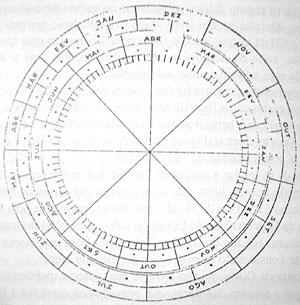 Janeiro meado, será meia-noite no braço esquerdo; e no fim do dito mês, será meia-noite uma hora acima do braço. Fevereiro meado, será meia-noite duas horas acima do braço; no fim do mês será meia-noite na linha do ombro esquerdo. [...] |