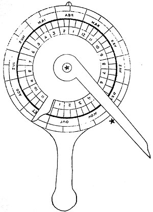 O procedimento seguido para saber as horas usando este instrumento é semelhante ao seguido com o primeiro instrumento. Começava por se orientar a roda, apontando o furo central para a Estrela Polar e o mês de Janeiro para Leste. Seguidamente, verificava-se qual a posição da Kochab e contava-se a diferença de horas entre esta posição e o mês em que se fazia a observação, indicado na escala mais exterior. Determinava-se assim o número de horas que faltavam ou passavam da meia-noite. Quanto ao procedimento para saber a hora do nascimento do Sol, que era a outra informação que se poderia obter nesta recta, ele também era bastante simples. Depois de conhecida a hora, num determinado instante, contava-se o número de horas até coincidir com o mês em que se estava, lido na escala mais interior. Não se conhece nenhum exemplar, nem nenhuma representação deste instrumento. Porém, pela descrição do mesmo no Leal Conselheiro, de D. Duarte, teria um aspecto semelhante ao da figura 8.