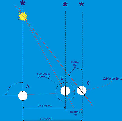 Consideremos o caso representado na figura 1. Na situação “A”, temos o Sol e uma estrela a passarem em simultâneo do meridiano do lugar, ou seja, podemos considerar esse instante como o início da contagem de um dia sideral e de um dia solar. Como a estrela está a uma distância muito grande, quando comparada com a distância Terra-Sol, podemos considerar que os raios de luz provenientes da estrela são paralelos entre si. Ou seja, na situação “B” completa-se um dia sideral. Entretanto, devido ao movimento de translação da Terra em torno do Sol, este teve um deslocamento aparente de cerca de 1 grau (percorre 360º em 365 dias). Ou seja, a Terra ainda tem que percorrer esse espaço na sua órbita até que se complete um dia solar, o que vai acontecer em “C”. O que é o mesmo que dizer que se tivermos um relógio que nos dê horas solares, verificamos que as estrelas passam pelo meridiano do lugar cerca de 4 minutos mais cedo de dia para dia. A este fenómeno chama-se “Aceleração das Fixas”.