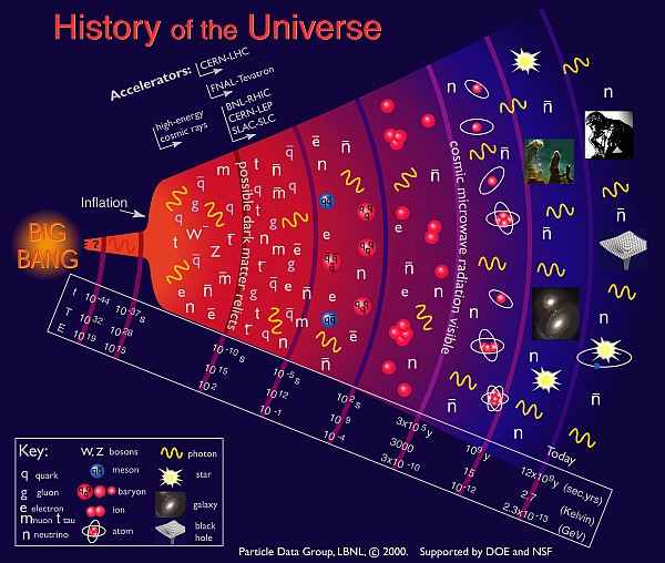 Durante os 13.8 mil milhões de anos de vida cósmica que a teoria consegue descrever, vários eventos ocorrem (ver abaixo), produzindo o quadro cósmico que hoje observamos e disfrutamos : um Universo vasto, muito pouco denso, frio, algo inóspito até, contendo uma fauna de objectos distantes e luminosos como galáxias, quasares e outros que lentamente se formaram.