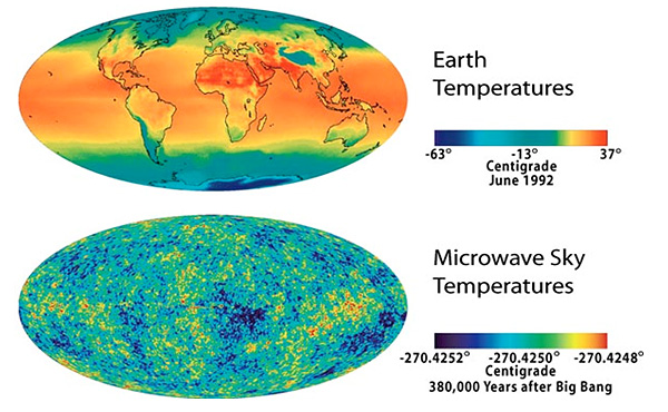 Tal como nas cartas climáticas, em que expressamos a temperatura do planeta Terra em graus, também podemos expressar a temperatura do Fundo Cósmico da seguinte forma.