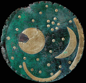 O disco de Nebra encontrado na Alemanha é a mais antiga representação real do céu vindo até nós da Idade do Bronze. Pensa-se, que o disco foi utilizado para determinar os solstícios e todas as datas de permeio com precisão bastante razoável. Leia mais sobre este disco no tema do Mês de Junho do Calendário da Astronomia 2006. Imagem: Landesmuseum für Vorgeschichte de Sachsen-Anhalt (RFA).