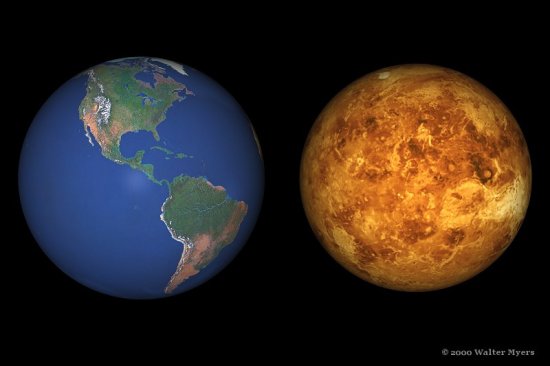 Comparação entre o Planeta Terra e Vénus. Créditos: Walter Myers (2000).