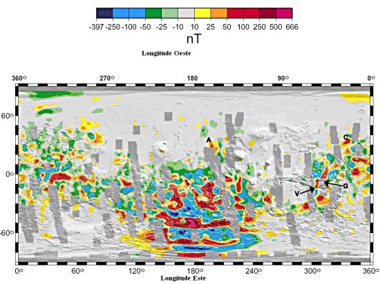 Componente radial do campo magnético (Br) normalizado para 200 km de altitude. As bandas a cinzento-escuro mostram zonas de cobertura inadequada. A letra “V” indica o local junto a Valles Marineris e “G” junto a Ganges Chasma, onde a magnetização aparece truncada. “A” e “C” indicam figuras magnéticas em terrenos recentes a Oeste do Monte Olimpo (A) e a Este de Chryse Planitia (C). Créditos: Michael Purucker, 2000.