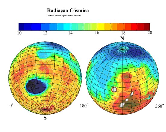 Globo de Marte com distribuição de radiações, entre 15-500 MeV, modeladas a partir da pressão atmosférica. Escala de cores em valores de dose equivalente a rem/a. Créditos: Mars Odyssey, NASA.